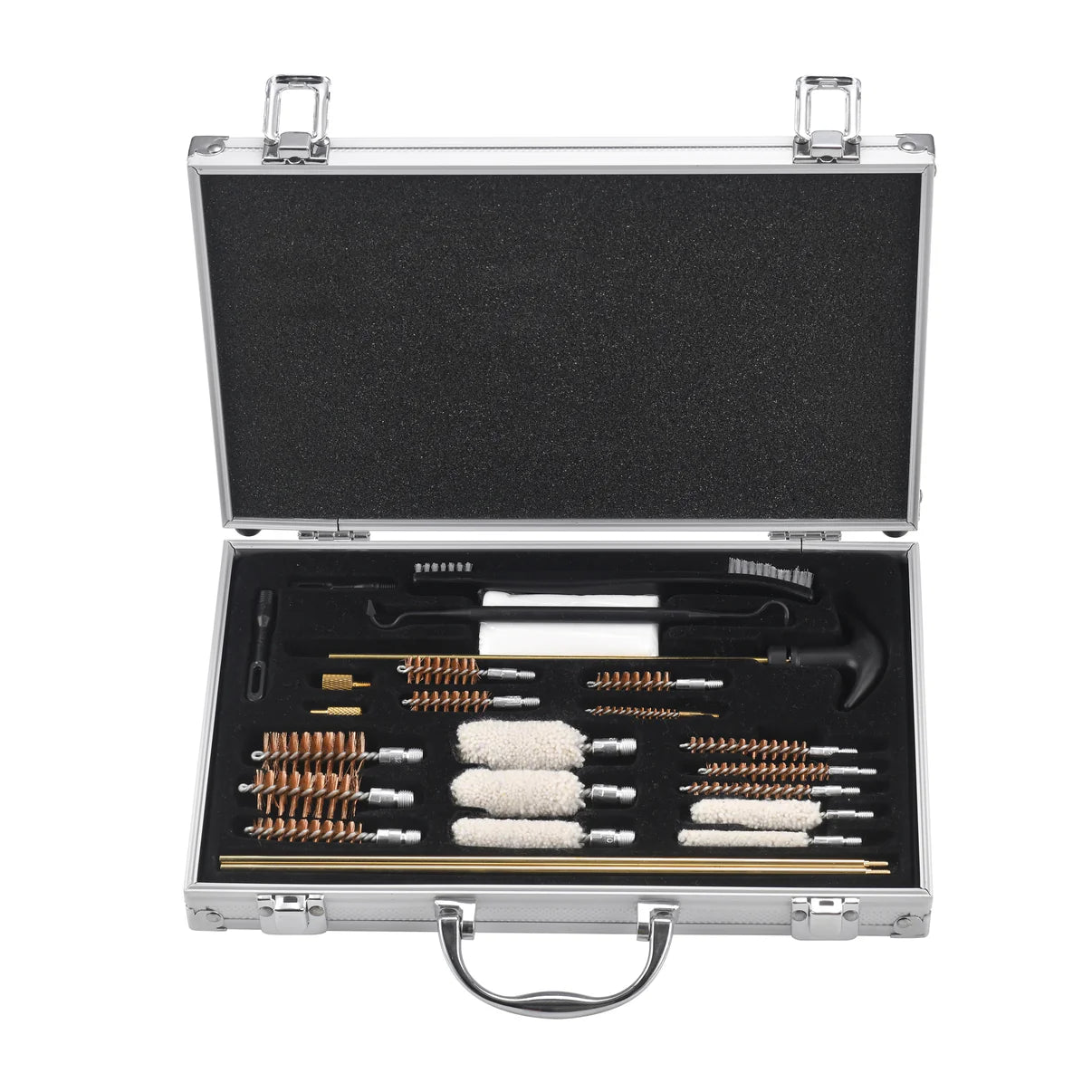 Komplet sadrži četke, šipke, nastavke i alat za temeljno čišćenje cevi i svih delova oružja.